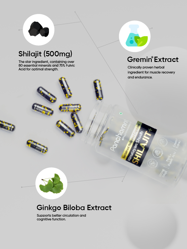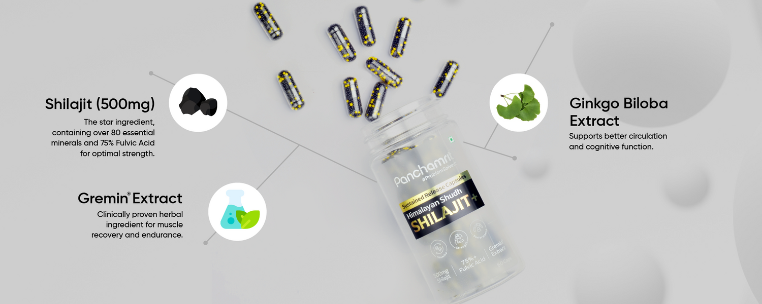Experience next-level energy with Panchamrit’s New Sustained Release Shilajit Capsules. Each capsule contains 500 mg of pure Himalayan Shilajit and Gremin® extract with innovative 8-hour sustained release for enhanced absorption and long-lasting benefits. With 2.5x more Shilajit per serving, our convenient, mess-free capsules support muscle recovery, consistent energy, and peak performance.