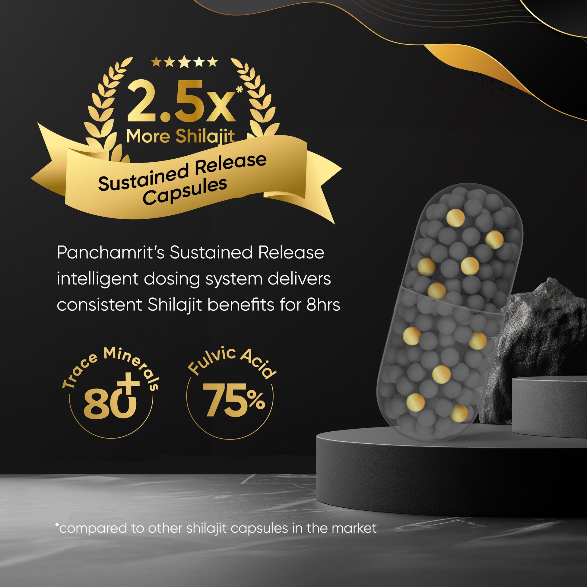 Experience next-level energy with Panchamrit’s New Sustained Release Shilajit Capsules. Each capsule contains 500 mg of pure Himalayan Shilajit and Gremin® extract with innovative 8-hour sustained release for enhanced absorption and long-lasting benefits. With 2.5x more Shilajit per serving, our convenient, mess-free capsules support muscle recovery, consistent energy, and peak performance.